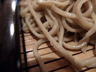 蕎麦・・・新そば 白っぽい色合いにて光り輝く蕎麦肌 平細打ち この日のそばの香り仄か