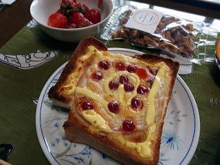 メインは食パンにハム・チーズを載せマヨネーズで覆いケチャップで味付け