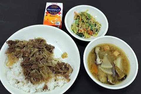 牛丼(麦ごはん)・ごまあえ・田舎汁・オレンジジュース